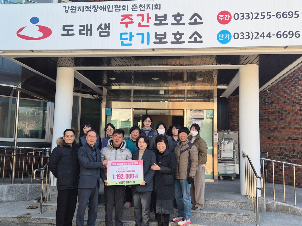 강남동주민자치회 (회장 원상봉)는 11월 21일 강남페스티벌 먹거리장터 판매금 1,192천 원을 춘천 도래샘 주간 보호소에 기부했다.