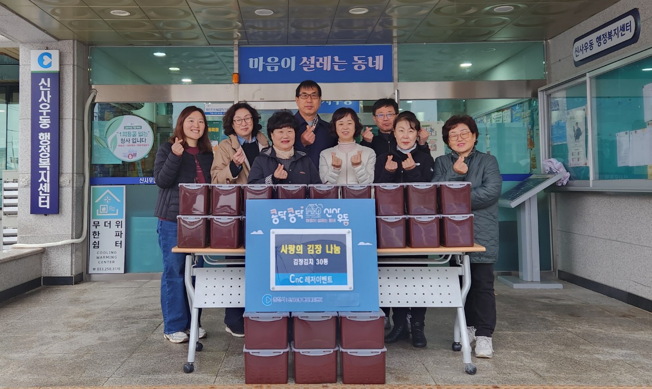Cnc 레저이벤트(대표 김덕만)는 11월 25일 신사우동 독거노인 및 저소득가정을 지원을 위해 김장김치(약 170kg)와 연탄(1,000장)을 기부했다.