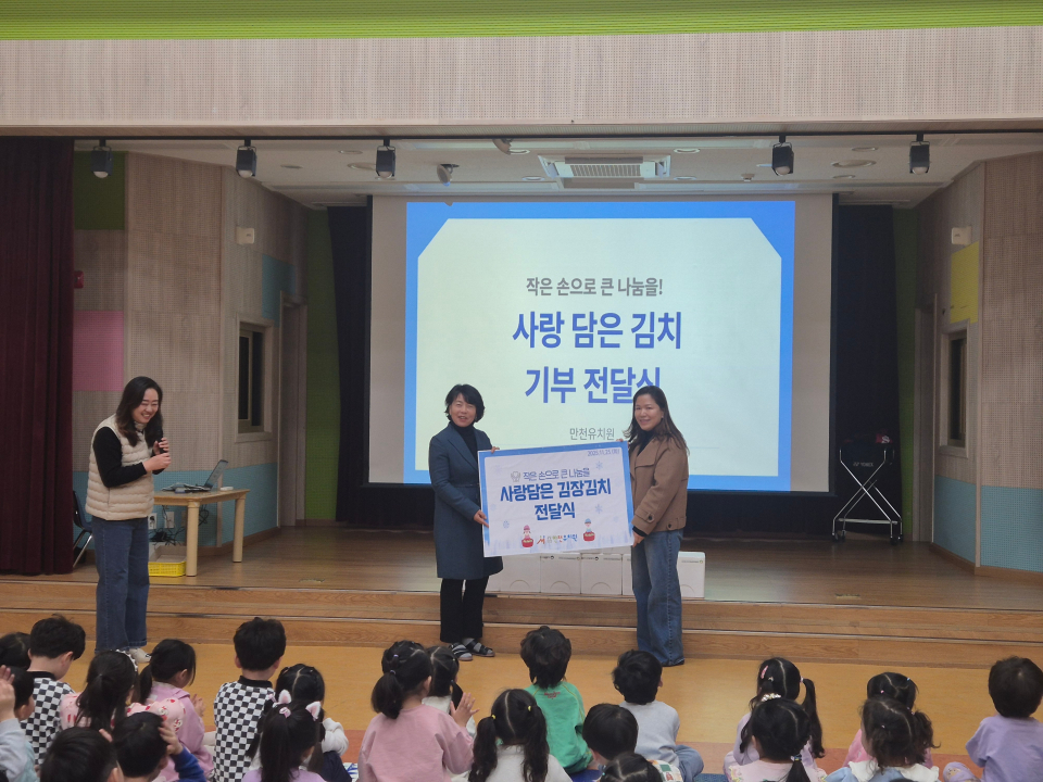 만천유치원(원장 이금자)은 11월 25일 관내 취약계층을 지원을 위해 직접 담근 김치 11박스(55kg)를동면행정복지센터에 기탁했다.