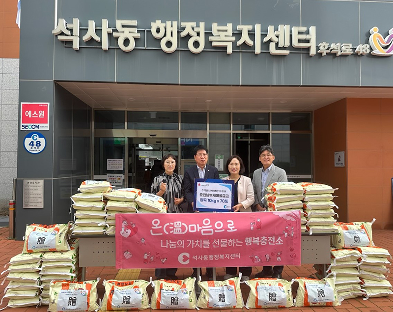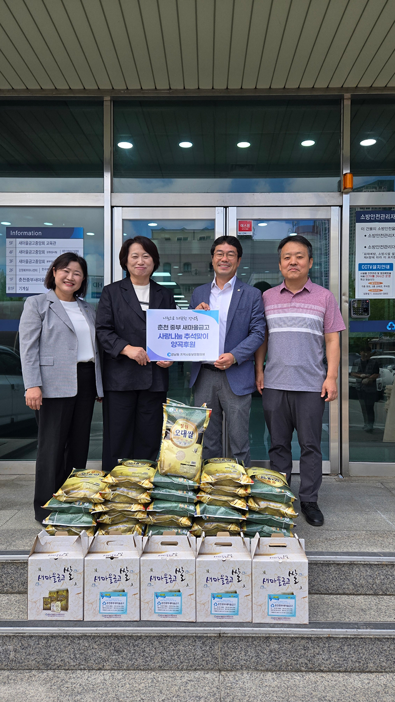 춘천중부새마을금고(이사장 이계영)는 9월 25일 추석을 맞아 취약계층을 위해 양곡 4kg 30포(60만 원 상당)를 △강남동지역사회보장협의체 △효자1동행정복지센터에 전달했다.