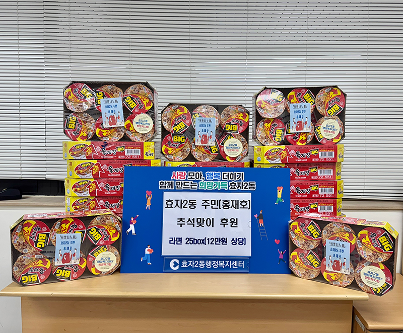 홍재호(효자2동주민)는 9월 25일 추석을 맞아 관내 저소득가정을 위한 라면 25상자(12만 원 상당)를 효자2동행정복지센터에 전달했다.
