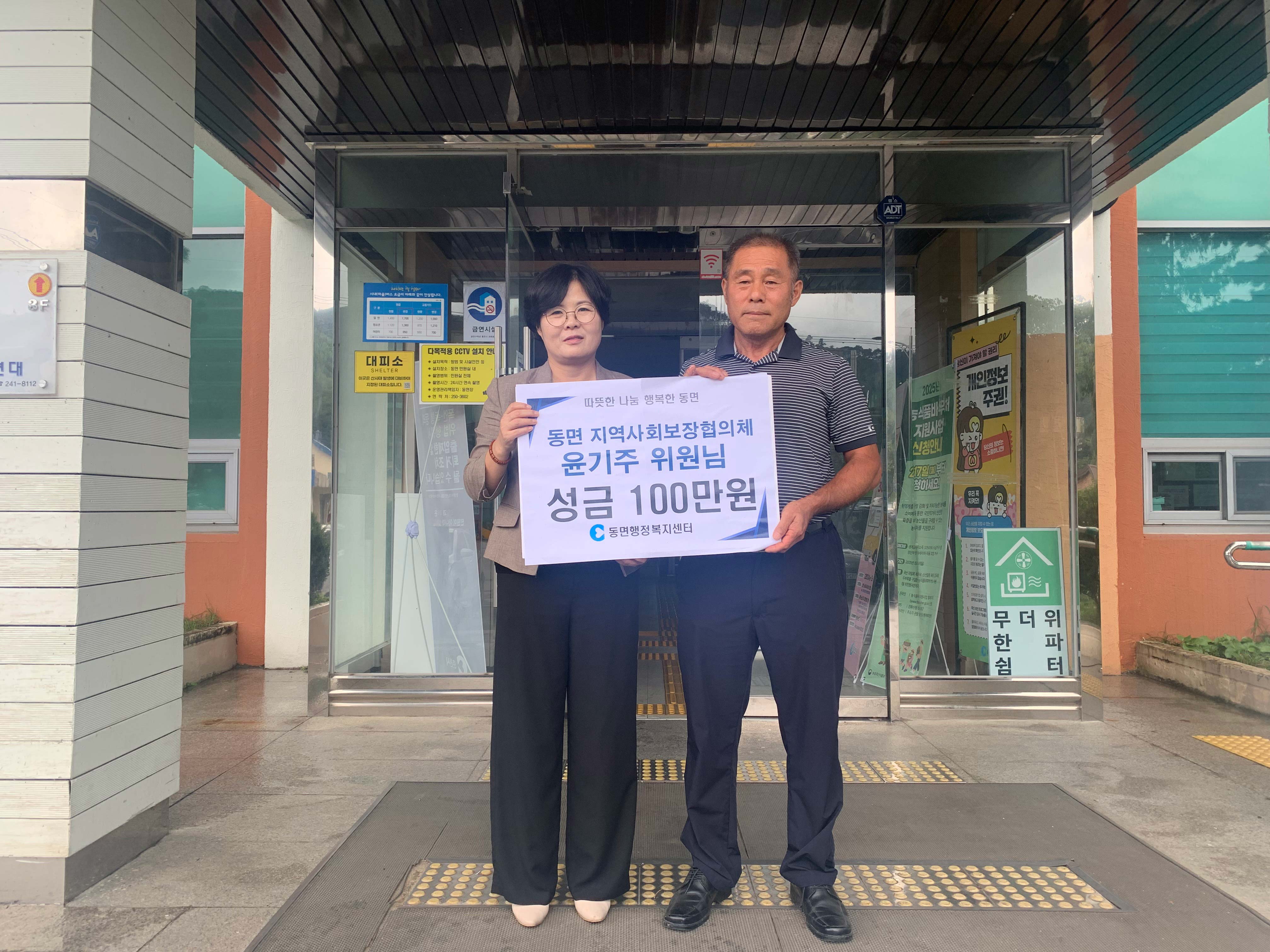 윤기주(동면지역사회보장협의체 위원)는 9월 1일 동면행정복지센터에 취약계층을 위한 성금 100만원을 기탁했다.