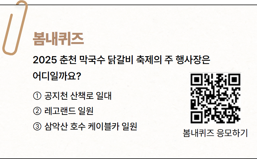 게다가 시내 100여 개 업소가 할인 프로모션에 참여해, 닭갈비는 1인분 3,000원, 막국수는 1,500원 할인 혜택을 제공한다. 최대 7만 명이 함께 즐길 수 있는, 말 그대로 도시 전체가 축제장이 되는 셈이다.
