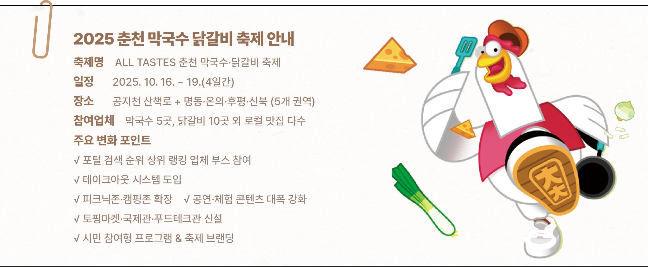 이 모든 변화는 단순한 기획이 아니라 도시 브랜드 전략에서 출발했다. 2025 춘천막국수·닭갈비축제는 단순히 먹고 즐기는 축제가 아니다. 춘천을 미식 도시로 각인 시키고, 로컬 브랜드와 시민을 주인공으로 끌어들이는 도시형 브랜딩 실험이기도 하다.