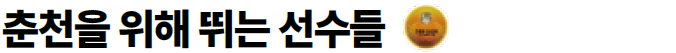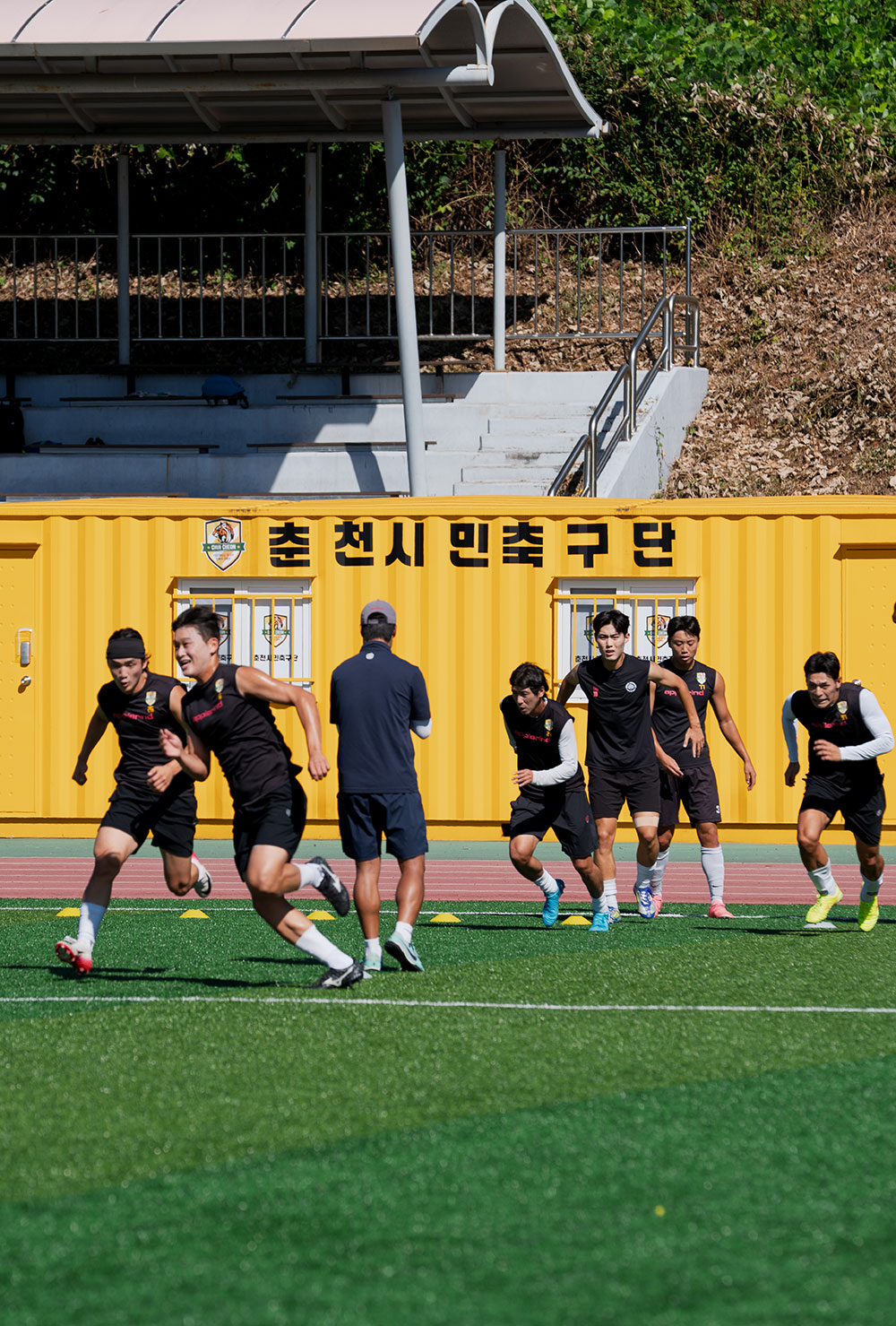 매년 선수들이 조금씩 바뀌긴 하지만, 올해는 2006년생 20살부터 37살까지 총 34명의 선수가 뛰고 있다. 그중에서도 맏형을 맡고 있는 박선용 선수는 전남 해남 출신으로 올해는 춘천에 새롭게 둥지를 틀었다. 2012년 전남 드래곤즈에 입단하면서 프로 선수 생활을 시작한 박 선수는 포항, 아산, 목포를 거쳤고 FC목포에 있을 땐 K3리그 통산 100경기 출전 기록을 세우기도 했다. 자신을 ‘고참’이라 말하는 그는 젊은 선수들 사이에서 중심을 잘 잡아주고 있었다. “어린 선수들이 저를 조금 어려워하지만, 제가 채워야 할 부분이 있다고 생각해요. 감독님도 그런 부분을 믿고 저를 불러주신 것 같아요. 그리고 제가 나이가 있다 보니 체력이 떨어질 거라는 시선이 있는데, 그걸 깨고 싶어요. 그러기 위해서 더 노력해야죠. 은퇴 전에 리그 통합 우승을 해 보는 게 목표입니다.”