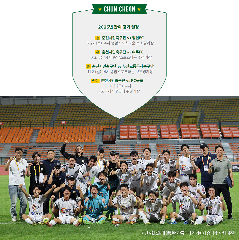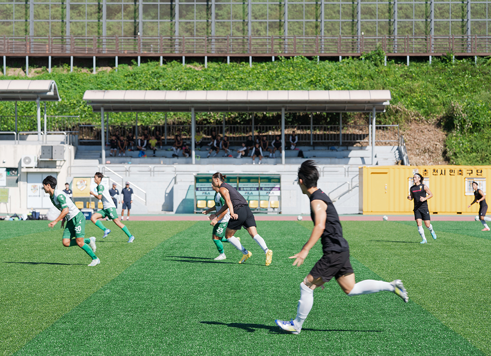 9월 10일 수요일 오후, 송암스포츠타운 보조경기장을 찾았다. 구름 한 점 없이 새파란 가을하늘이었지만, 기온이 30도까지 올라 1분만 서 있어도 땀이 줄줄 흘렀다. 지난주 강릉에서 열린 2025 K3리그 23라운드에서 강릉시민축구단을 4대 2로 이긴 춘천시민축구단 선수들은 밝은 표정으로 경기장에 모여들었다. 강릉을 상대로 승리를 거둔 건 2년 만이었다. 최근 강릉시의 가뭄으로 인한 재난 상황으로 경기가 무관중으로 진행됐음에도 경기 내내 팽팽한 공방전이 펼쳐졌고 레오, 김도형, 이동현, 김기현 선수의 골로 결국 승리를 거머쥔 것.