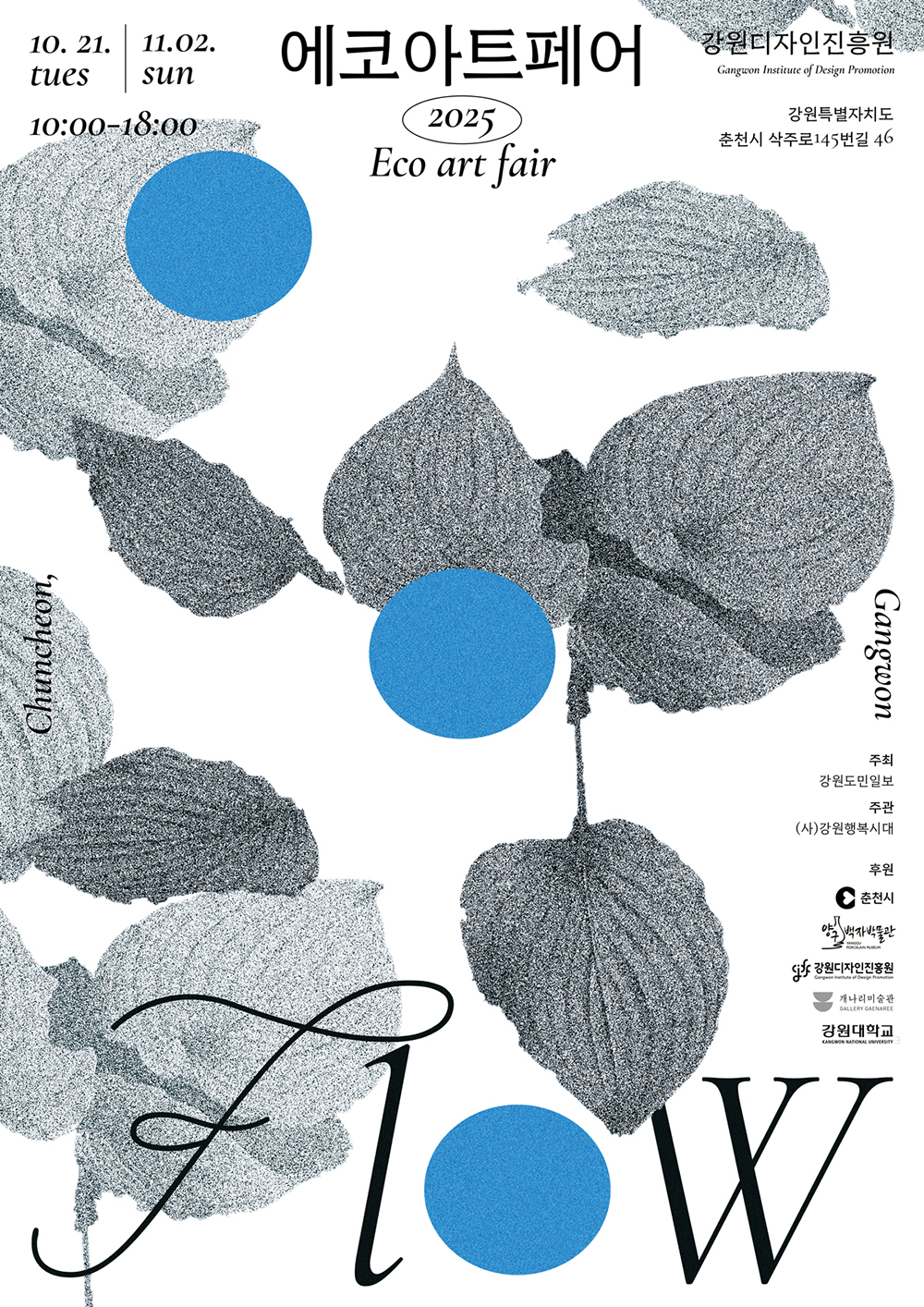 에코아트페어의 올해 주제는 ‘FLOW’로 강원도의 자연을 토대로 지역에서 외부로, 또 외부에서 지역으로 이어지는 교류의 흐름을 작품을 통해 드러냄과 동시에 서로 다른 맥락과 경험들이 하나의 예술적 흐름 속에서 만나는 과정을 담고 있습니다. 1전시실에서는 양구백자박물관과의 협업을 통해 도자예술로 구성된 특별전이 진행되며, 2전시실에서는 지역작가들과 주요 아트페어에서 활동하는 외부 작가들을 초대하여 구성되는 회화, 조각 작가들의 작품이 전시됩니다. 마지막으로 1층 전시실에서는 <강원신진작가 공모전> 선정작가들의 신선한 작품들이 함께 합니다.