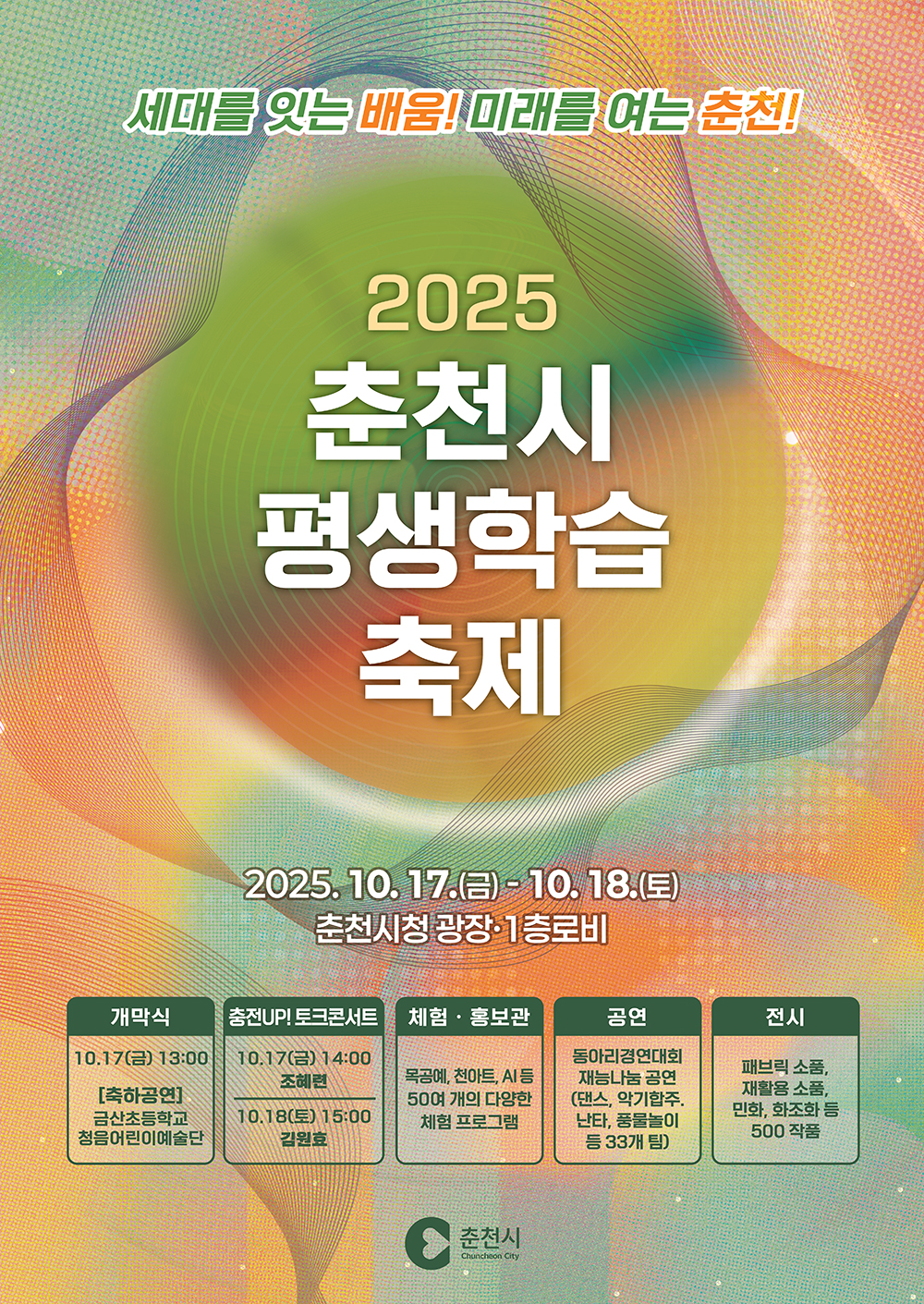 제5회 춘천시 평생학습축제는 춘천의 평생교육기관·단체와 학습 동아리가 참여하여 소통과 화합의 장을 마련하고 평생학습의 의미를 되새길 수 있는 축제입니다. 배움의 길을 걸어온 학습자들의 성과를 전시와 무대에서 만나볼 수 있고, 남녀노소 누구나 줄길 수 있는 체험 프로그램도 가득 마련했습니다. 개막식은 10월 17일 13시로 금산초등학교 청음어린이예술단의 힘찬 공연으로 시작하여, ‘충전UP! 토크콘서트’ 와 동아리경연대회, 재능나눔 공연으로 무대를 더욱 빛냅니다, 또한 다양한 작품으로 준비한 전시관은 멋진 작품세계를 보여드립니다. ‘세대를 잇는 배움! 미래를 여는 춘천!’으로 춘천시민 여러분을 초대합니다.