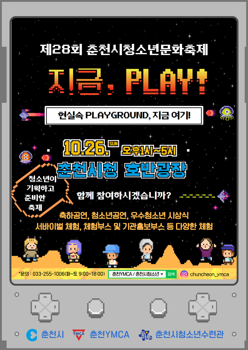 제28회 청소년문화축제는 ‘현실속 PLAY-GROUND, 지금 여기!’라는 슬로건으로 청소년이 직접 기획한 청소년들의 춘천시 대표 청소년 축제입니다. 이번 축제는 온라인에서 오프라인으로 나와 현실에서 만나 함께 놀아요라는 주제로 공연마당(노래, 댄스, 밴드)과 체험마당(레이저 서바이벌 체험, 음악창작 체험, 비즈체험, VR체험, 놀이체험 등), 각종 홍보부스와 이벤트 등을 준비했습니다. 청소년과 시민이 함께 소통하고 즐기는 축제의 장으로 청소년의 열기를 느낄 수 있는 문화축제로 놀러오세요!