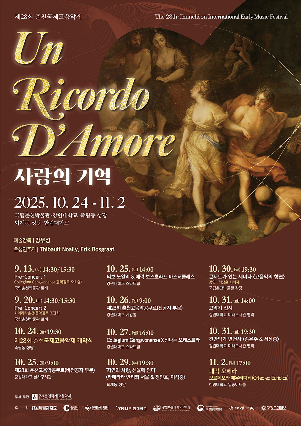 제28회 춘천국제고음악제는 “Un Ricordo D’Amore-사랑의 기억”을 주제로 열립니다. 세계적인 고음악 아티스트 티보 노알리와 에릭 보스흐라프를 비롯한 국내외 연주자들이 함께하며, 개막 공연, 콩쿠르, 마스터클래스, 렉처콘서트, 오페라 등 다채로운 무대가 춘천 곳곳에서 펼쳐집니다. 깊은 울림과 새로운 감동으로 시민 여러분을 이 특별한 음악의 향연에 초대합니다!
