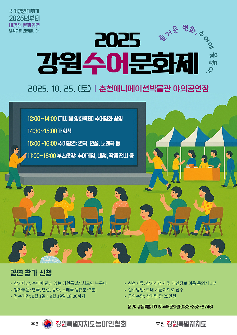 오는 10월 25일(토), 춘천 애니메이션박물관 야외공연장에서 <2025 강원수어문화제 - 즐거운 변화, 수어에 물들다>가 열립니다. 이번 문화제는 순위를 매기는 대회가 아닌, 모두가 함께 즐기는 축제 형식으로 준비되었습니다. 다양한 수어 공연뿐만 아니라 농아인 작품 전시, 수어 체험과 게임, 포토존 등 가족과 친구가 함께 즐길 수 있는 체험 부스도 풍성하게 마련됩니다. 평소 접하기 어려운 수어와 농문화를 가까이에서 느낄 수 있는 특별한 기회, 여러분의 많은 관심과 참여를 기다립니다.