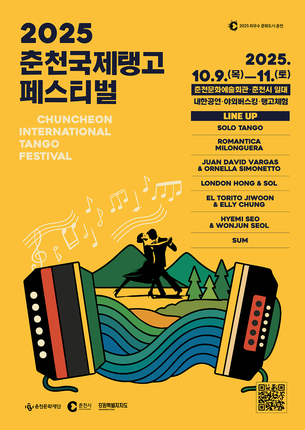 낭만의 도시, 로맨틱 춘천에서 즐기는 가을의 열정. 가을빛 호반도시 춘천이 탱고의 선율로 물듭니다. 세계적인 탱고 오케스트라 내한 공연과 시민이 함께 즐기는 무대, 그리고 춘천만의 낭만적인 야경 속 탱고 파티까지! 올 가을, 춘천에서 사랑과 열정의 탱고 축제를 함께 즐겨보세요!