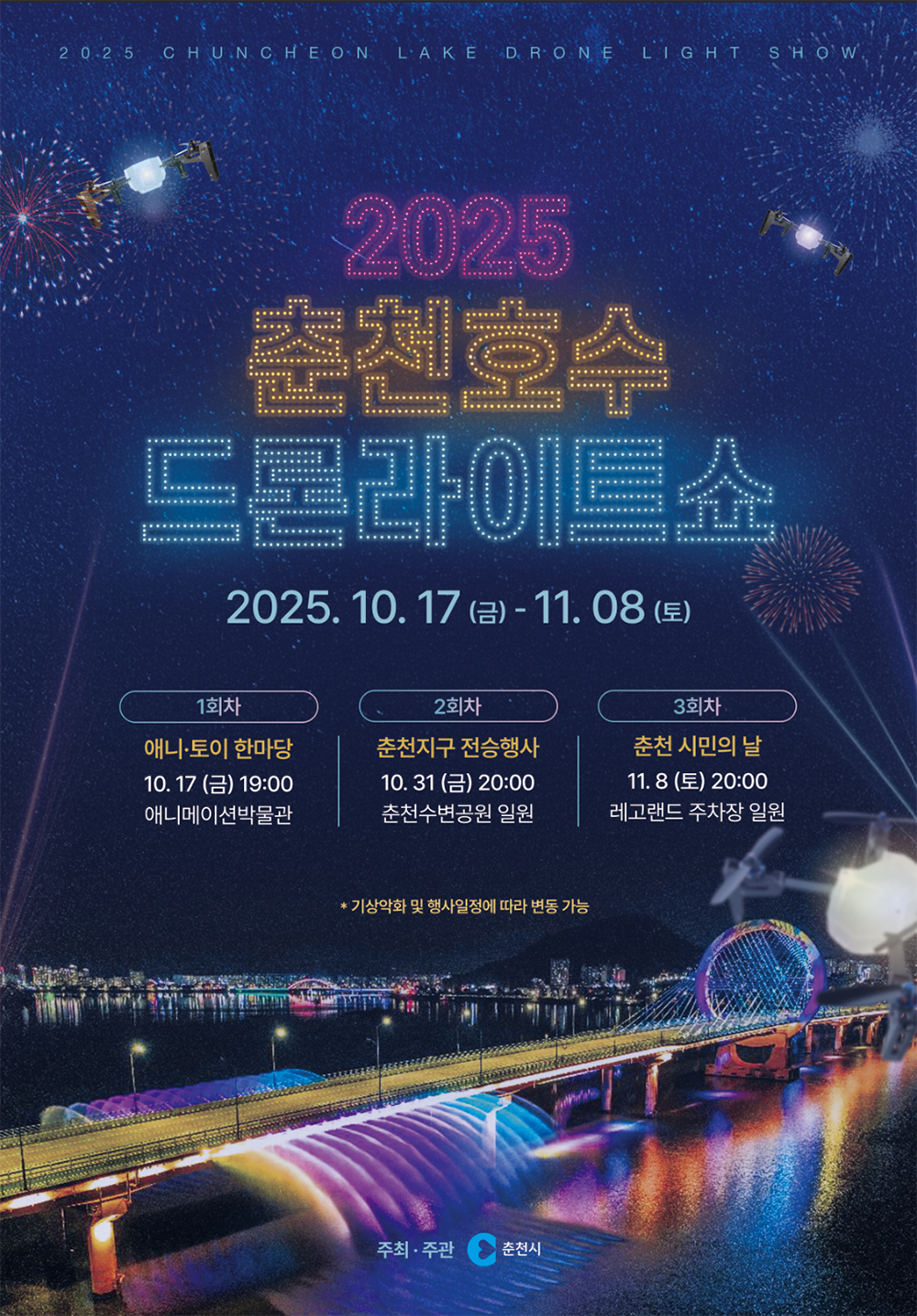 가을 밤하늘을 가득 채울 환상의 드론쇼! 「2025 춘천호수 드론라이트쇼」가 여러분을 찾아갑니다. 1,500대의 드론이 춘천의 아름다운 야경을 빛낼 때 가족과 연인, 친구들과 함께 잊지 못할 추억을 남겨보세요. 이번 드론라이트쇼는 애니·토이 페스티벌, 춘천지구 전승행사, 춘천시민의날 행사와 함께 총 3회 진행되고, 각기 다른 테마로 다채로운 볼거리를 제공합니다. 밤하늘을 수놓는 감동의 현장에 여러분을 초대합니다!