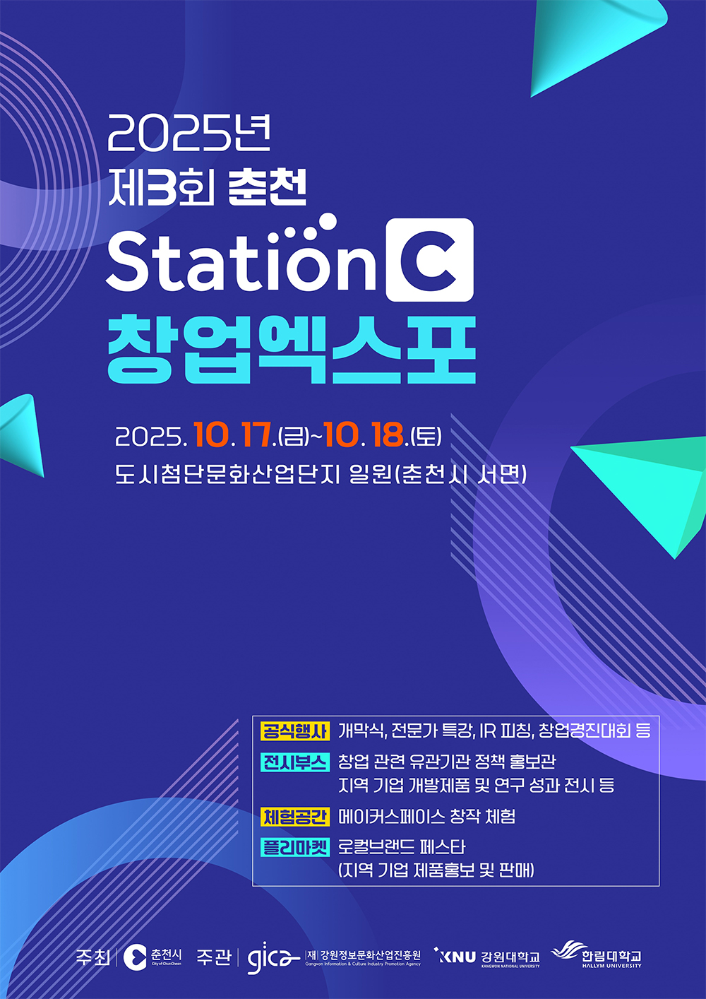 춘천의 창업창업 생태계 혁신을 위한 2025 춘천 Station C 창업엑스포가 개최됩니다. 창업지원기관들과의 협력 강화와 창업문화 확산을 도모하는 이번 행사에서는 개막식,¤IR 피칭, 창업아이디어 경진대회 발표, 전시부스 운영, 로컬브랜드페스타 등 다채로운 프로그램이 한자리에서 펼쳐집니다. 지역의 창업 역량을 집결시키고 새로운 창업 기회를 발굴할 수 있는 뜻깊은 자리가 될 예정이니 창업에 관심 있는 시민 여러분의 많은 관심 및 참여 바랍니다.