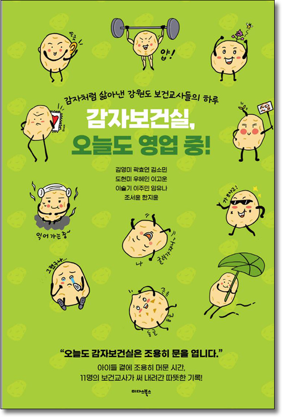 누구나 학창시절 한 번쯤 보건실에 들른 기억이 있다. 커튼이 드리운 침대에서 까무룩 잠들었던 순간, 예쁜 양호선생님(지금은 보건교사)을 찾아갔던 추억 말이다. 이번에 강원 지역 보건교사들이 모여 『감자보건실, 오늘도 영업 중!』을 펴냈다. 몇 평 남짓 보건실에서 벌어지는 다양한 에피소드와 교사들의 삶이 생생하게 담겼다. 배가 아프다고 찾아온 아이에게 ”괜찮아?“ 라는 한 마디가 약이 되는 순간을 나누는 이들은, 오늘도 학생들의 몸과 마음을 돌본다.