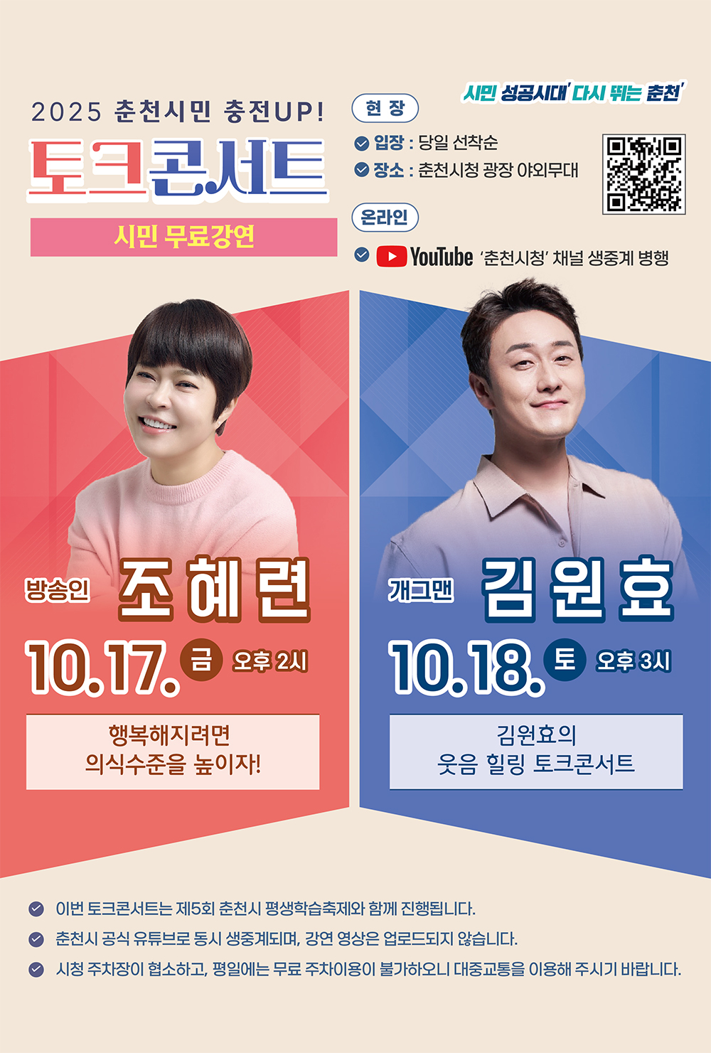 일상 속 지친 우리 마음을 충전 UP!하는 토크콘서트가 제5회 춘천시 평생학습축제와 함께합니다.