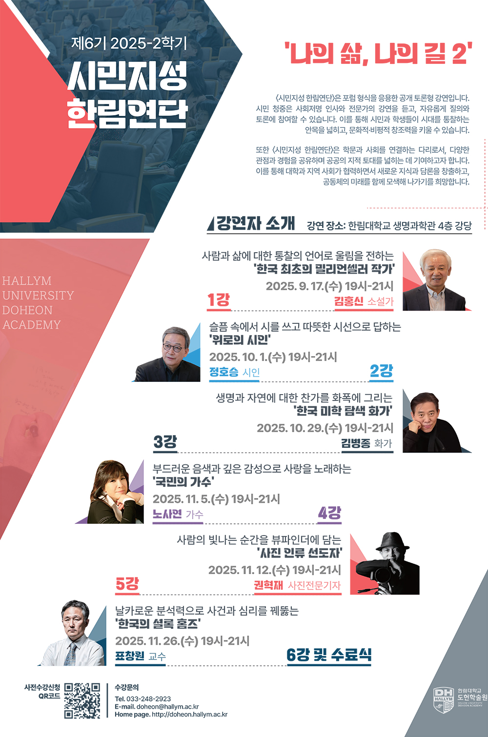 ‘시민지성 한림연단’은 교양과 문화적 깊이를 더하는 시민 교양 강좌입니다. 사회 저명 인사와 전문가를 초청하여 강연을 진행하며, 공개 토의와 질의응답을 통해 시민과 학생이 함께 소통하고 참여할 수 있는 장을 제공합니다. 이 강좌를 통해 참석자 모두가 시대적 안목을 넓히고, 문화적·비평적 창조력을 함양하길 기대합니다.