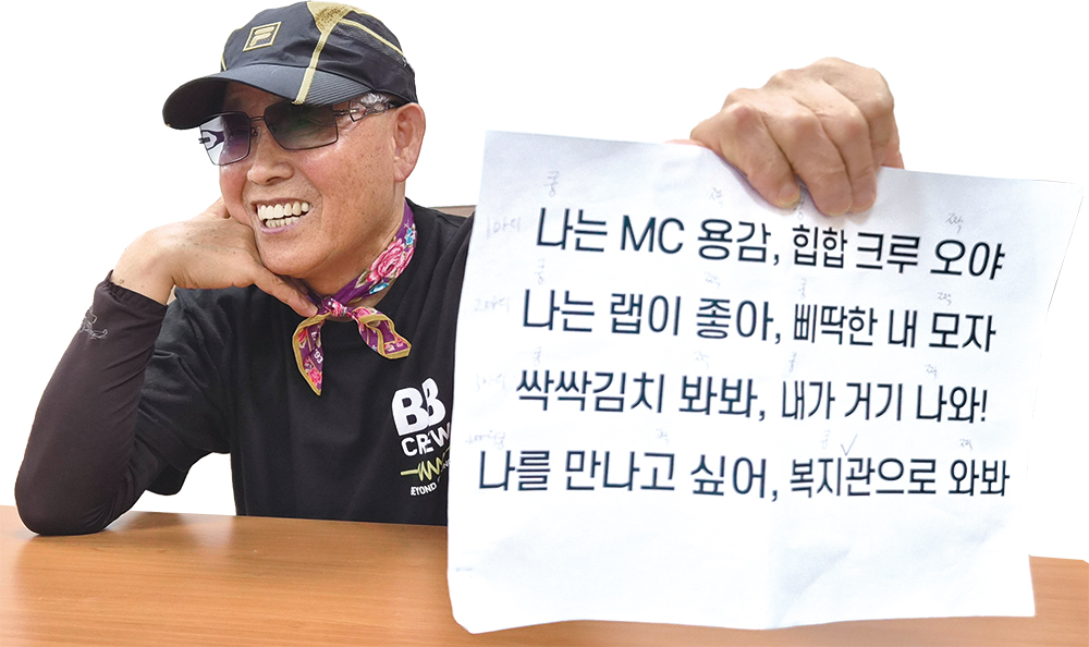 “Yo~ 나는 MC 용감. 나는 랩이 좋아, 삐딱한 내 모자. 싹싹김치 봐봐, 나를 만나고 싶으면 복지관으롸 와봐~!”