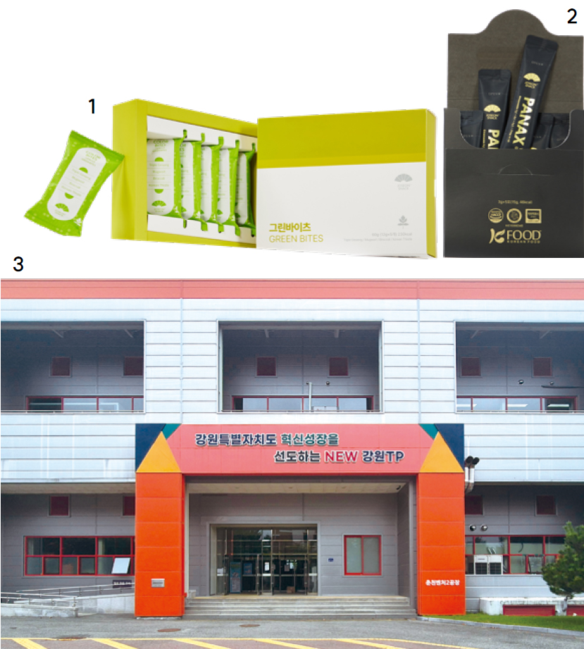 1, 2. 조선간식 대표 제품인 ‘컬러바이츠’ 와 ‘파낙스’ 상품 3. 연구소 전경