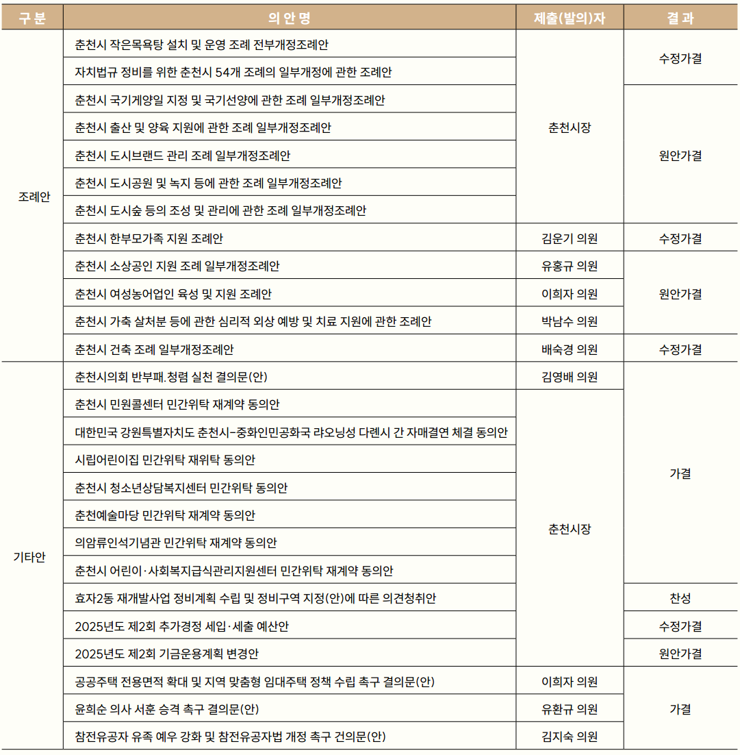 한편, 「춘천시 시민고충처리위원회 위원 위촉 동의안」은 이번 의사일정에서 제외했다. 김진호 의장은 “지난 임시회에서 이미 부결된 안건을 본질적 변경 없이 다시 상정하는 것은 지방자치법 제81조에 저촉될 수 있다. 또한 부결된 안건을 그대로 상정하면 의회의 일관성과 책임성에 대한 시민들의 불신을 초래하게 된다”며 “절차적 흠결과 내용적 문제를 보완한 후 재상정하는 것이 바람직하다”고 했다. 춘천시의회는 앞으로도 법적 원칙과 절차적 정당성을 지키며, 시민의 신뢰에 부응하는 의정활동을 이어갈 계획이다.