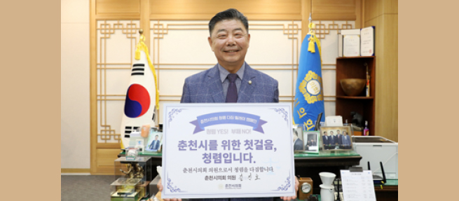 춘천시의회(의장 김진호)는 9.2.(화)부터 ‘청렴 다짐 릴레이 캠페인’을 전개한다. 첫 주자는 김진호 의장이 맡았다. 김진호 의장은 ‘춘천시를 위한 첫걸음, 청렴입니다’는 메시지를 전하며, 청렴을 다짐했다. 이어 전체 의원들이 청렴 다짐 릴레이 캠페인에 참여할 예정이다.