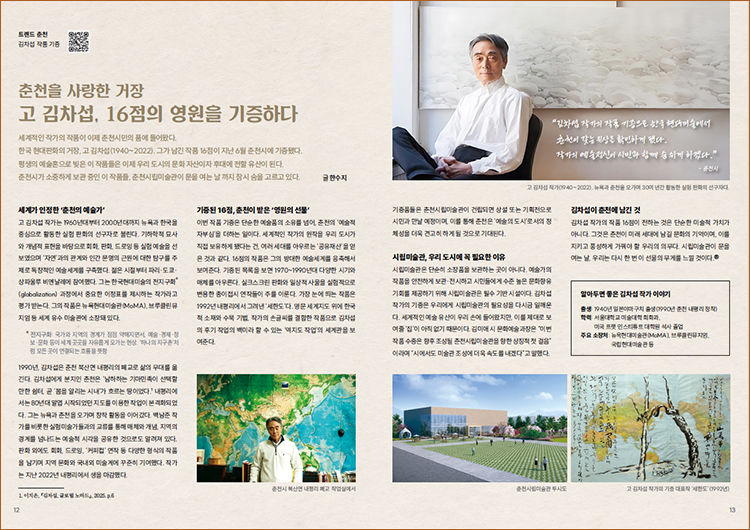 거장 고 김차섭 작가의 작품들이 춘천시에 기증됐는 소식에 놀랐습니다. 정말 유명한 분이잖아요. 춘천에 드디어 미술관이 생기나보네요. 춘천에서도 더 수준 높은 문화 향유 기회가 많아지면 좋겠습니다.