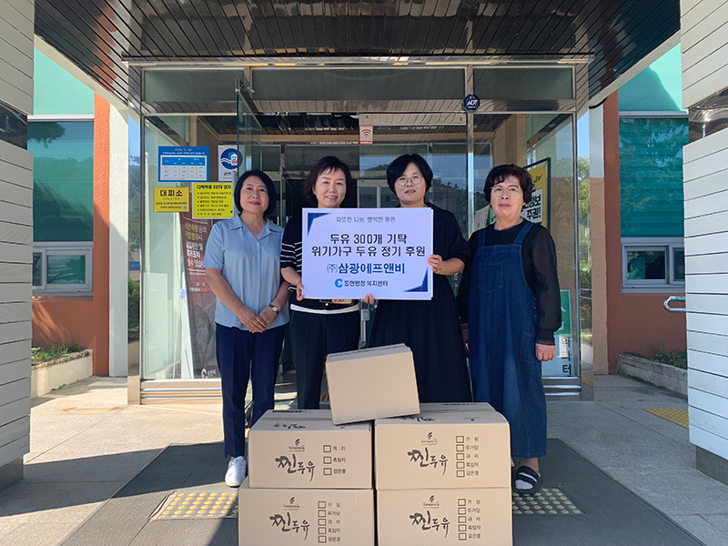 ㈜삼광에프앤비(대표 이미자)는 9월 11일 동면 부자가정 위기가구에 두유 정기후원과 취약계층을 위한 두유 300개를 동면행정복지센터에 전달했다.