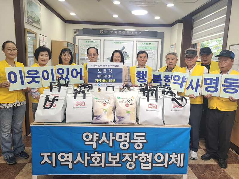 약사명동지역사회보장협의체(위원장신진태)는 9월 16일 보문각(대표김선미)에서 후원받은 양곡(4kg 10포)과 반찬꾸러미를 관내 취약계층 35가구에 전달했다.