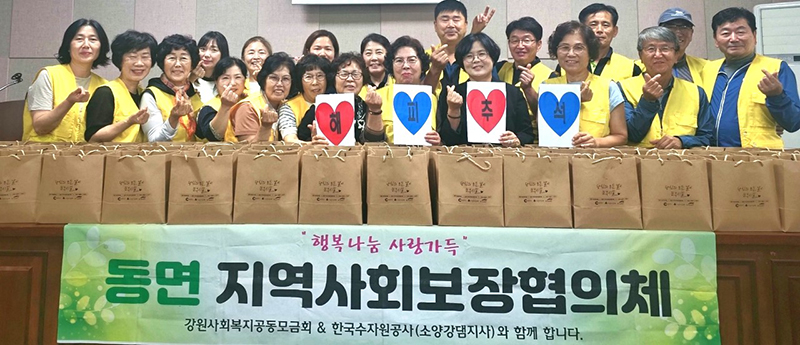 동면지역사회복지협의체(위원장 변옥철)는 10월 2일 추석을 맞아 강원사회복지공동모금회와 K-water 소양강댐지사의 후원받은 송편과 삼광 F&B에서 기부한 두유를 취약계층 80가구에 전달했다.