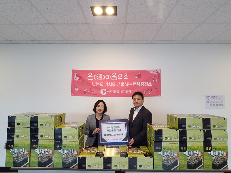석사동주민자치회(회장 박병관)는 9월 19일 추석을 맞아 관내 취약계층을 위한 김 36박스(50만 원 상당)를 석사동행정복지센터에 전달했다.