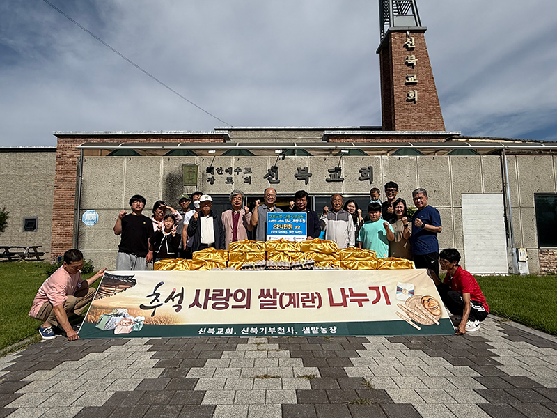 신북교회(담임목사 이창봉)는 9월 27일 추석을 맞아 햅쌀 500kg와 샘밭농장에서 기부한 계란 50판을 관내 소외된 이웃 50가구에게 전달했다.