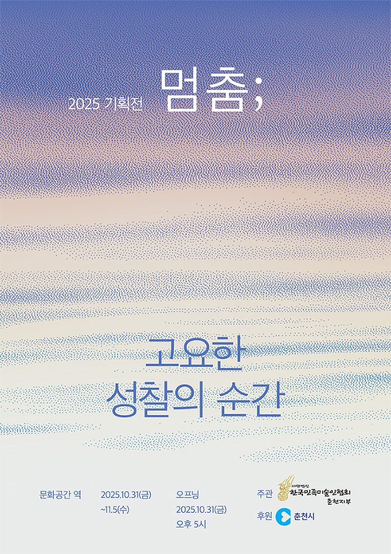 ‘시간의 멈춤’, ‘생각의 멈춤’, ‘에너지와 소비의 멈춤’ 세 가지 주제를 통해 정지된 아름다움, 내면의 평화, 그리고 지속 가능한 삶의 가치를 탐색합니다. 분주한 남춘천역에서 마주하는 이번 전시는 단순한 감상이 아닌, 멈춤을 통해 새로움을 발견하는 예술적 체험이 될 것입니다.
