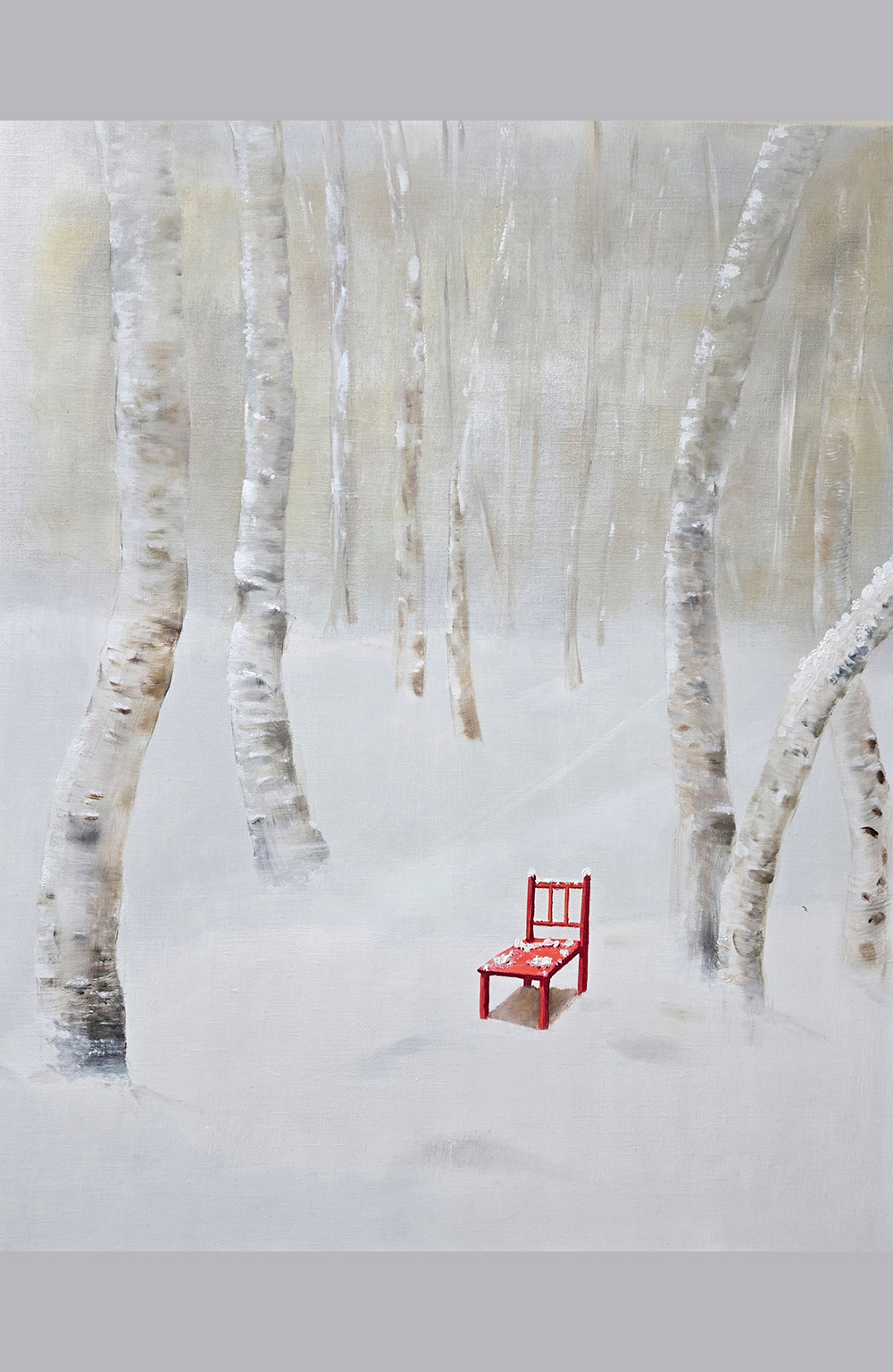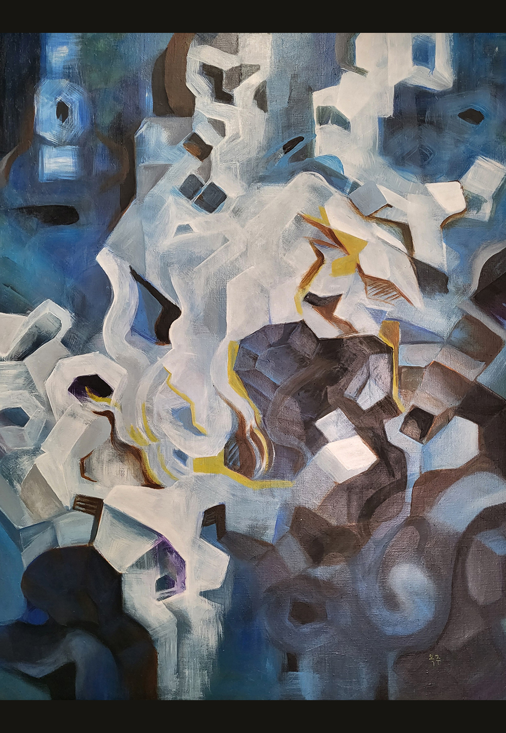 흐르는 시간의 틈에 오래된 기억이 부유하며, 잊힌 감정들은 도시의 건물과 도로, 나무 등에서 시간의 층위를 구름의 추상적 구조와 쌓아가는 형태로 구조적이고 입체적으로 표현된다. 재료는 유화로, 여러 번 그린 형상 위에 겹겹이 표현된 푸른빛과 흰색의 층위가 서로 얽히며 공간감을 만들고, 그 속에서 작고 밝은 노랑과 흰색의 흐름은 시간의 틈 사이로 스며드는 빛 혹은 흔적을 떠올리게 한다. 이는 시간의 파편으로 기억의 단층을 지나며 남는 것으로, 자기 안의 과거와 현재를 동시에 마주하게 함을 의미한다.