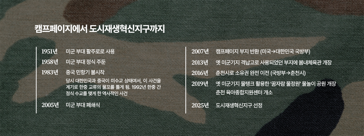 1951년 한국전쟁의 불길이 한반도를 휩쓸던 시기. 춘천의 도심 한복판에 미군기지 '캠프페이지(Camp Page)'가 들어 섰다. 이곳을 중동부전선의 미군 요충지로 만들기에는 제격이 어서 6·25전쟁 당시 미군의 제4미사일사령부와 주한미군 군 사고문단이 주둔하기 시작하면서 만들어졌다. 초기에는 길쭉한 고구마처럼 생긴 소양근화동 56만m2의 면적에 철조망 을 치고 수백 채의 천막 막사가 들어섰다. 세월이 지나 활주로를 닦고 비행장이 들어서고 막사는 콘크리트 건물로 바뀌었다. 부대 이름은 장진호 전투의 영웅, 명예훈장 수훈자인 '존 U.D. 페이지' 대령의 이름에서 비롯됐다. 이곳은 군수물자와 병력을 지원하는 항공기지로, 춘천의 발전과는 별개의 섬처럼 존재했다. 아이들은 철조망 밖에서 전투기 이륙 소리를 들으 며 자랐고, 시민들은 도시 한가운데 자리한 그 땅을 오랫동안 '들어갈 수 없는 곳으로만 기억했다.