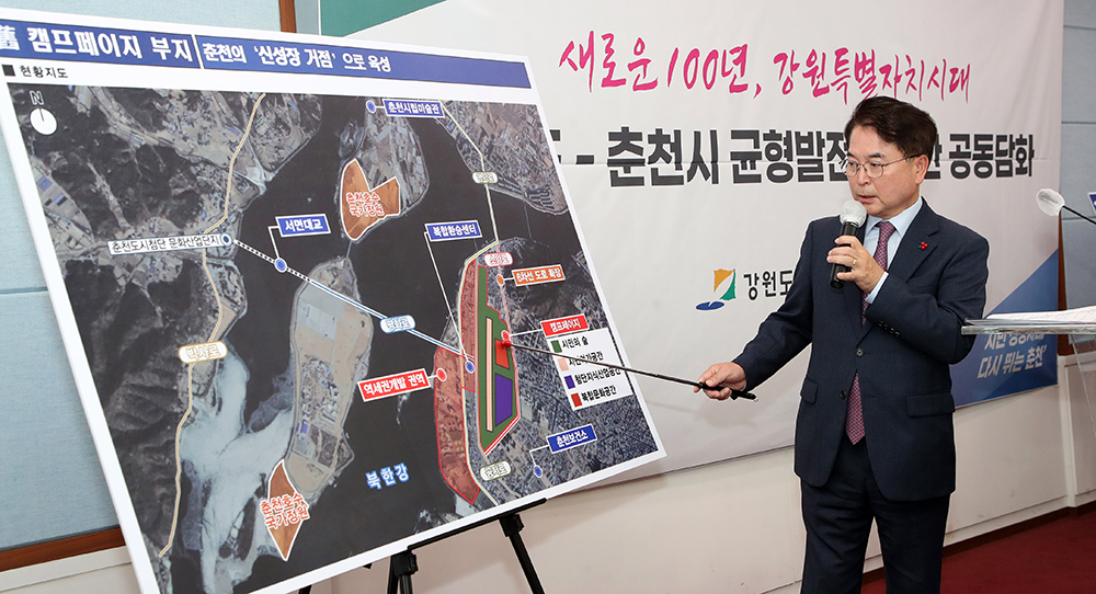 혁신지구는 문화와 산업의 중심지로, 새로운 일자리와 도시의 활력을 만들어내는 공간이 될 것입니다. 그야말로 미래 춘천을 그려가는 큰 그림입니다. 첨단 영상산업의 새로운 거점이자, 미래 문화산업을 선도하는 도시로 확실히 도약하겠습니다.Ⓑ