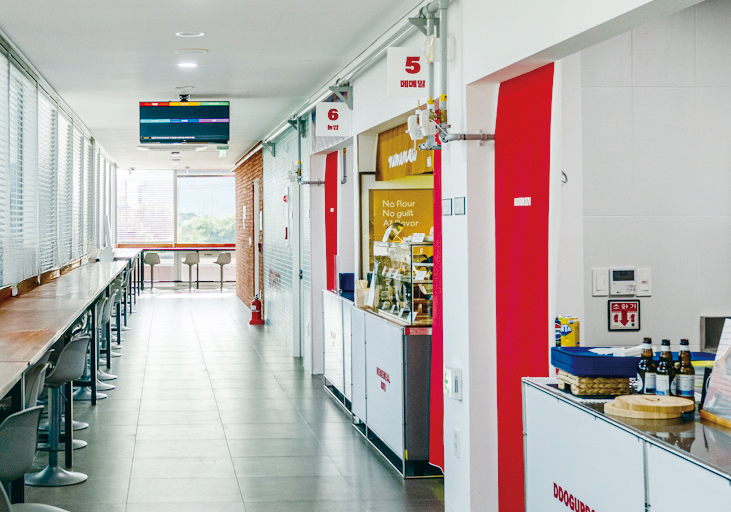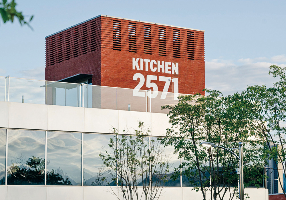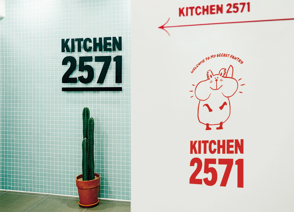 ‘KITCHEN 2571’이라는 커다란 로고가 눈에 들어온다. 그 안에는 여섯 명의 청년 창업가가 실전을 배우는 청년들의 실험주방 ‘키친2571’이 있다. 민트색 타일로 꾸민 인테리어는 공간 전체에 젊고 활기찬 에너지를 불어넣는다.