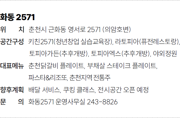 ‘화동2571’의 낮이 호수 빛을 머금는다면, 밤에는 야외정원에 켜진 조명이 시민의 산책길을 밝힌다. 앞으로 로컬푸드 페스티벌과 관광 연계 프로그램이 잇따라 열릴 예정이어서, 화동2571은 춘천의 미식 랜드마크로 자리 잡을 것으로 기대된다.