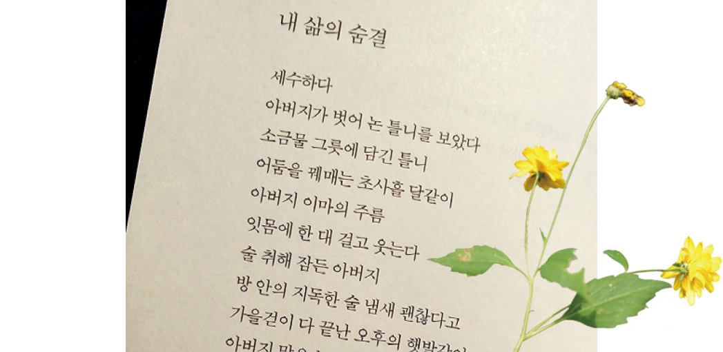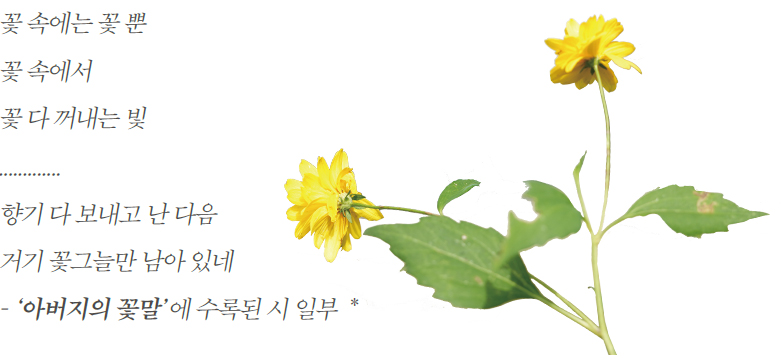 시인은 2017년 10월 31일 첫 시집 <아버지의 꽃말>을 출간했다. 아버지의 나무가 황금빛으로 빛나던 날이었다.