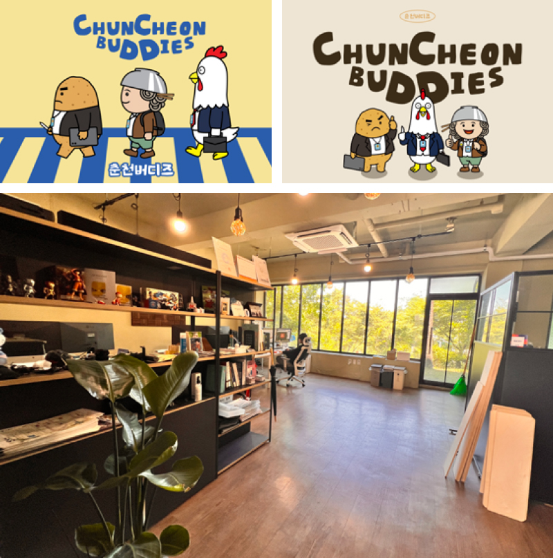 (위) 제작한 춘천 지역 캐릭터 ‘춘천버디즈’ 와 (아래) 잇다컴퍼니 사옥 내부