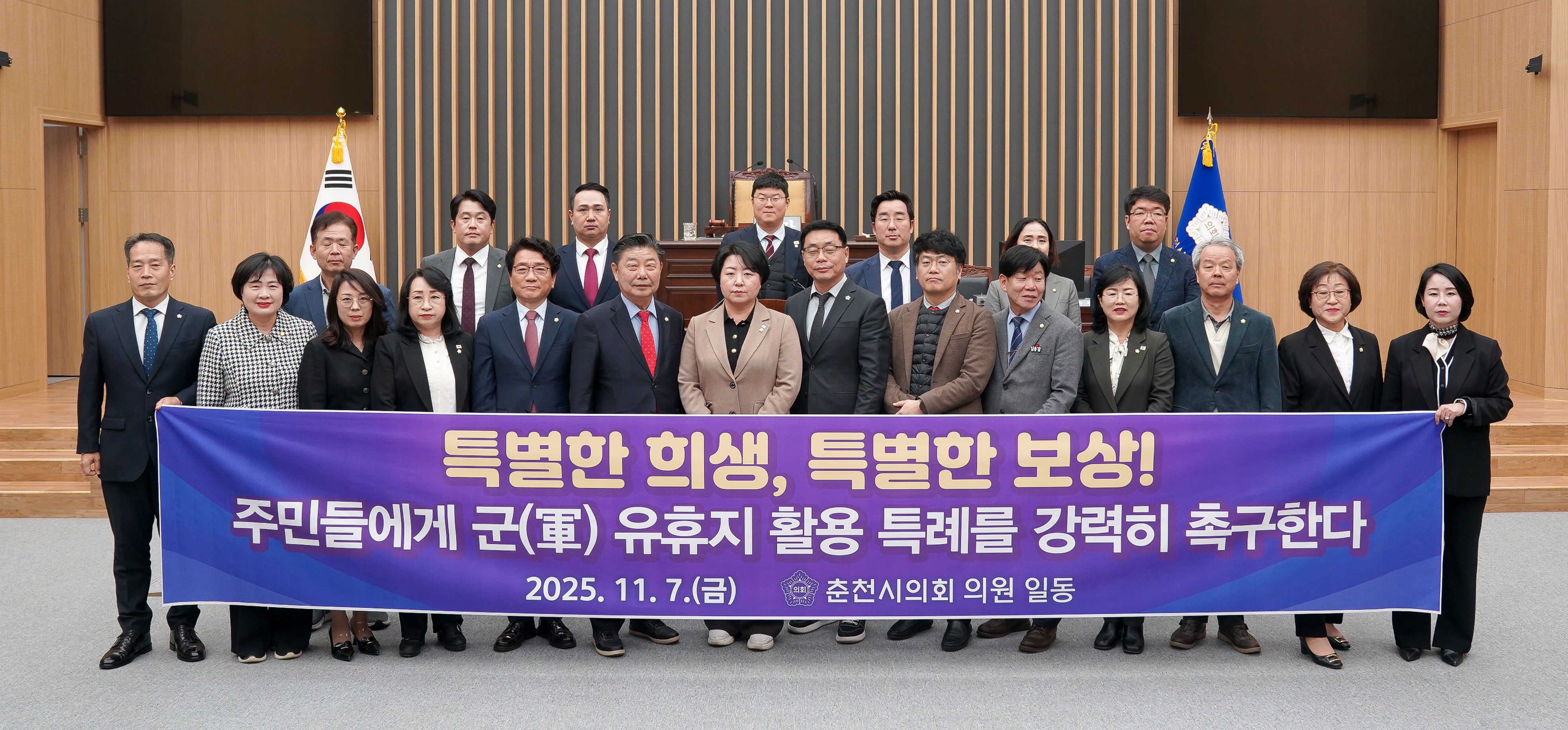 권희영 의원의 대표 발의로 춘천시 사북면 신포리 일대 군 유휴지 공공 환원 방안 마련을 촉구하는 「춘천시 군(軍) 유휴지 활용 특례 및 절차 개선을 위한 촉구 건의안」을 채택했다.