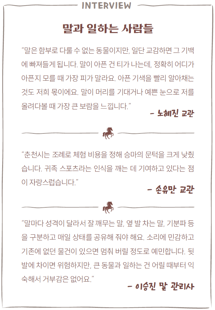 최 씨는 승마가 나이와 상관없이 즐길 수 있는 최고의 전신운동이라며 주변에 적극적으로 권한다고 덧붙였다. 그녀가 승마장을 좋아하는 이유는 단지 운동 효과 때문만은 아니다. 대기실 창밖으로 펼쳐지는 삼악산과 의암호의 풍경은 춘천공공승마장이 가진 또 다른 경쟁력이다.