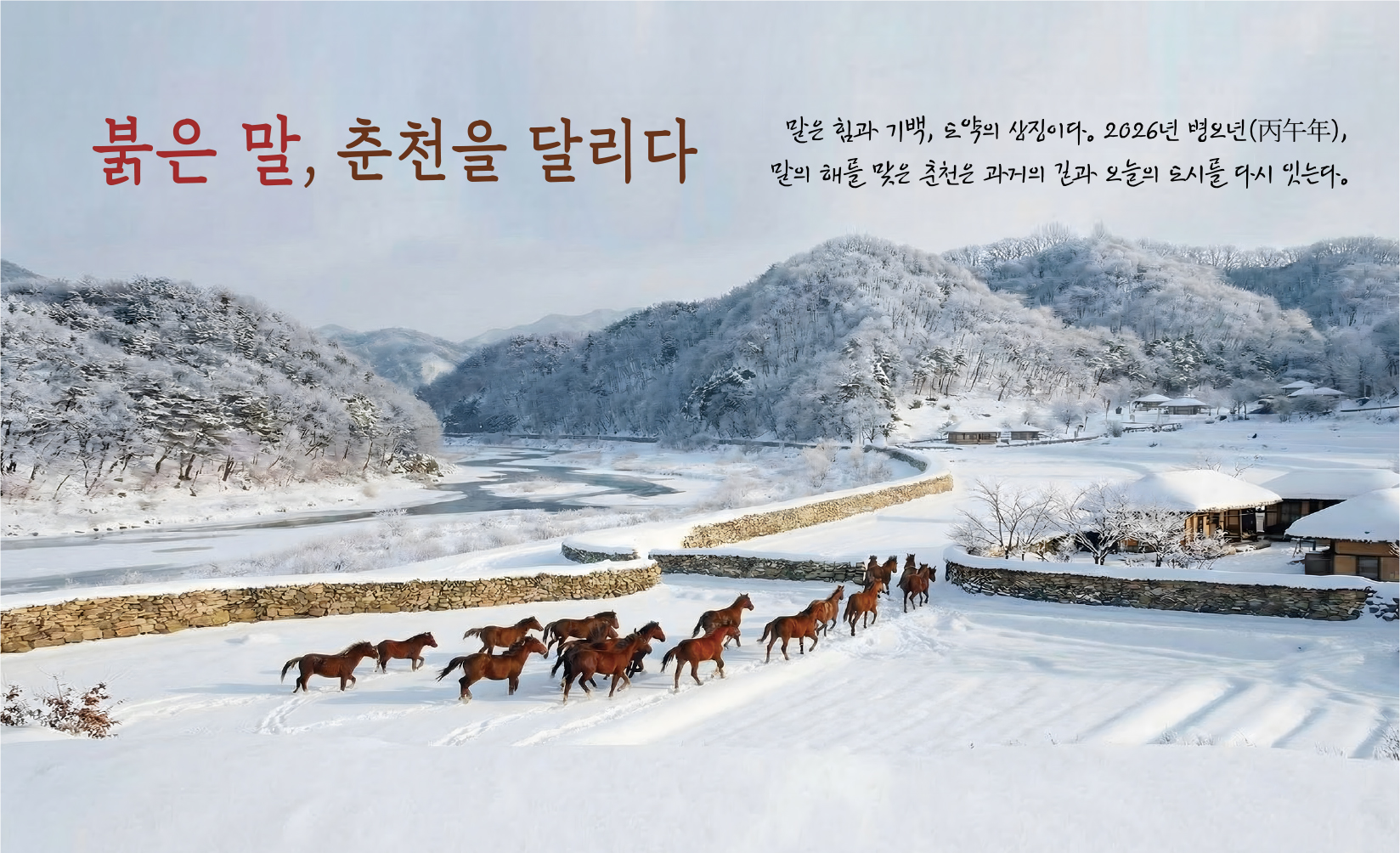 역참의 중심지로 말과 함께 도시 기틀을 닦아 온 춘천. 2026년 병오년, 붉은 말의 기운은 공공 승마장을 통해 시민의 일상 속으로 스며들고 있다. 과거의 말길 위에 세워진 도시는 이제 새로운 문화와 산업으로 도약하며, 시민과 함께 달리는 춘천의 내일을 그리고 있다.