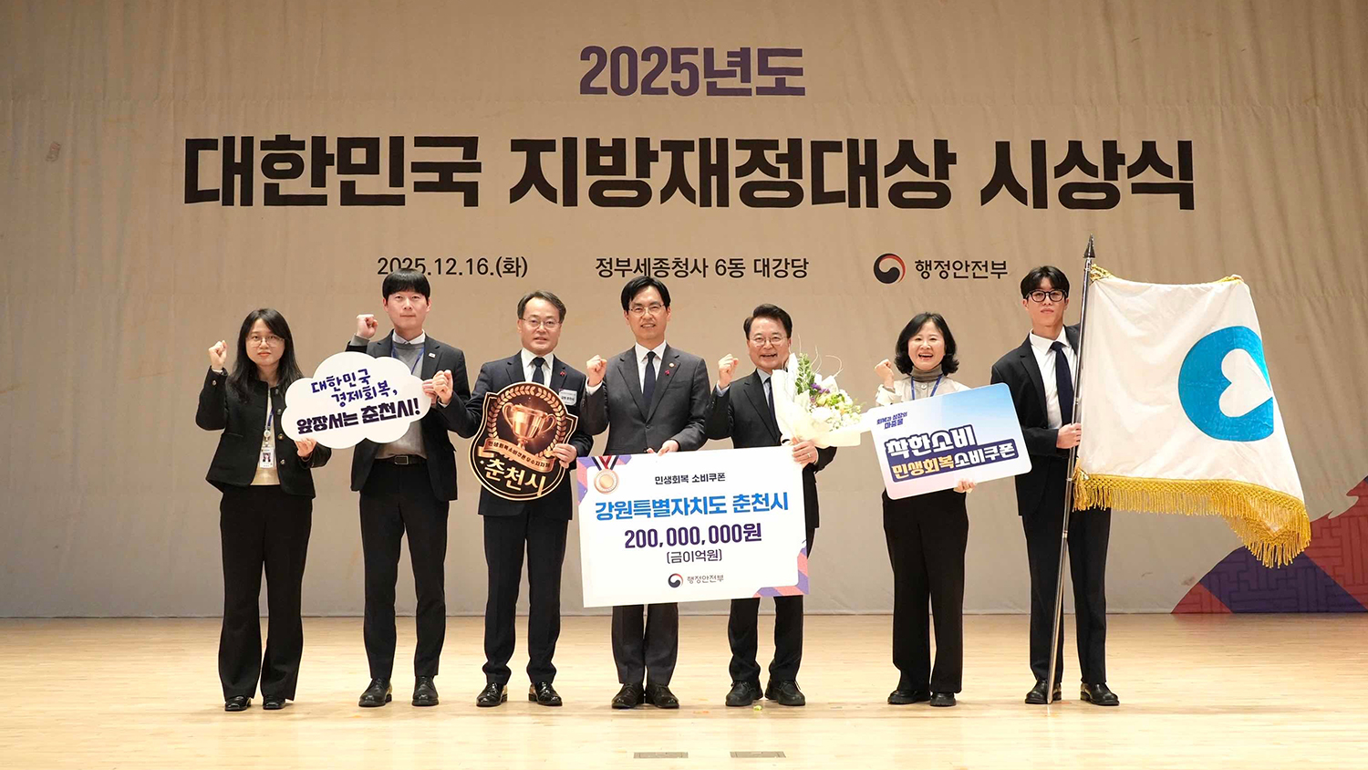 춘천시가 12월 16일 정부세종청사에서 열린 행정안전부 주관 2025 대한민국 지방재정대상에서 민생회복 소비쿠폰 집행 우수기관으로 선정 돼 전국 시 단위 기초 자치단체를 대표해 수상했다. 정부가 지난 7월부터 모든 국민을 대상으로 두 차례에 걸쳐 지원한 민생회복 소비쿠폰의 춘천시 신청률은 1차 99.27%로 전국 평균(99%)을 웃돌고 2차 역시 98.45%로 전국 평균(97.5%)을 상회했다. 거동이 불편한 어르신과 장애인을 위해 공무원이 직접 찾아가는 방문 신청 서비스를 운영하는 등 적극 행정을 펼친 결과다. 이를 통해 민생회복 소비쿠폰을 시행한 전국 243개 지자체 중 탁월한 집행실적으로 전국 지자체 상위 20%에 해당하는 ‘가’등급을 획득하고, 부상으로 특별교부세 2억 원도 확보했다. 높은 참여율은 지역경제 회복으로 이어졌다. 춘천 지역에서 총 800억원이 골목상권을 중심으로 소비되며 민생경제 회복의 마중물 역할을 했다.