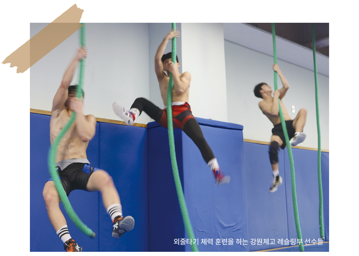 ‘포기하고 싶어질 때 왜 시작했는지 기억하라!’ 훈련장 벽에 걸린 문구다. 지금도 온몸이 땀범벅이 되도록 훈련하고 있을 강원체고 레슬링부에게 힘찬 응원의 박수를 보낸다.