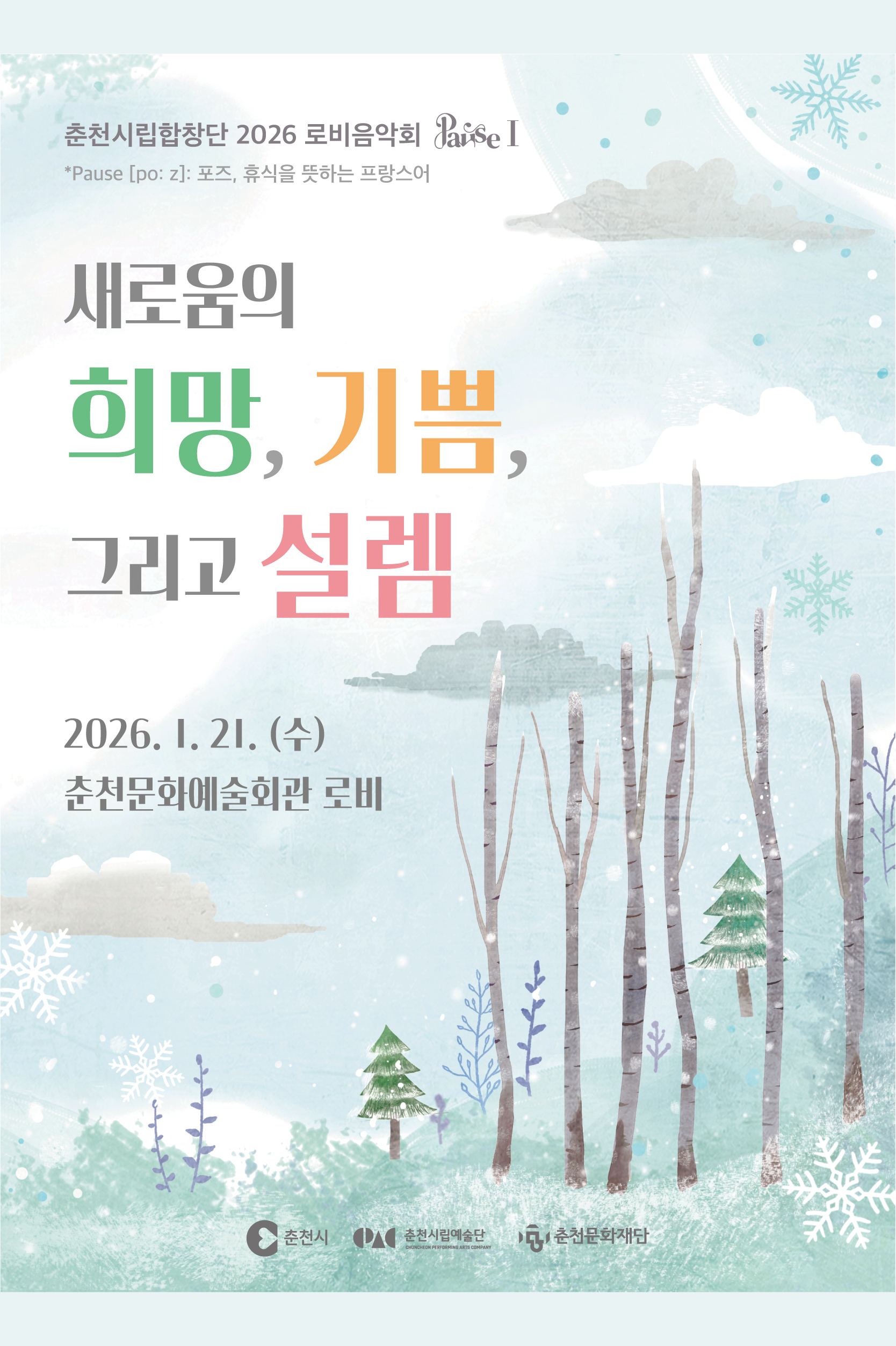 춘천시립합창단의 특별함을 담은 로비음악회가 새해를 맞아 새로운 시리즈로 여러분을 찾아갑니다. 합창단과 눈을 맞추며 함께 호흡하면 음악의 선율을 한층 더 여유롭게 느낄 수 있습니다. 분주한 일상에 작은 쉼표(Pause)를 찍듯, 새로운 마음으로 휴식의 시간을 채워 보시기 바랍니다.