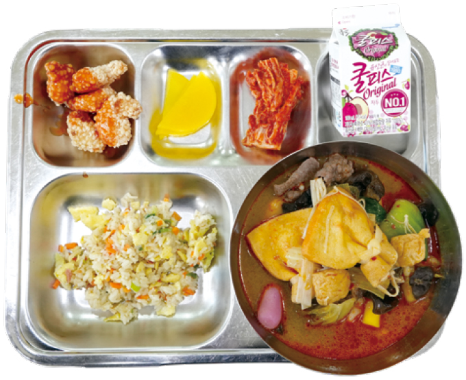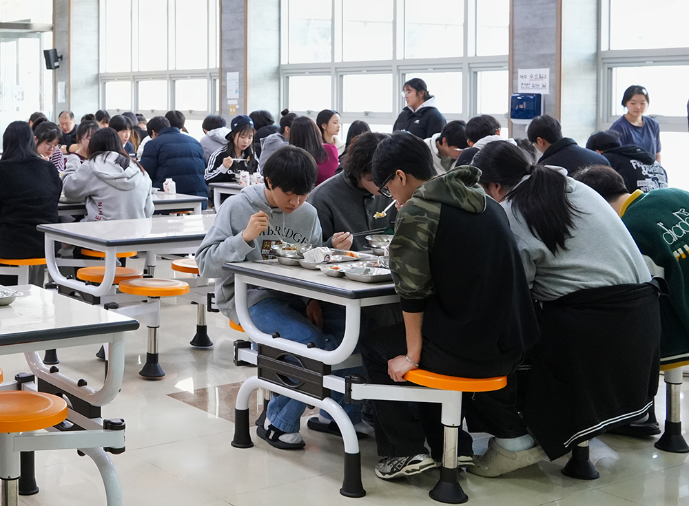 점심시간이어서 식당에 갔다. 학생들이 줄을 서서 배식을 받는데 오늘은 마라탕이다. 수요일은 특식이 제공된다고 한다. 메뉴판을 보니 요일별로 다양한 메뉴가 적혀 있다. 학생들과 선생님들이 함께 식사하며 조용히 담소하는 모습이 가족 같은 분위기다.