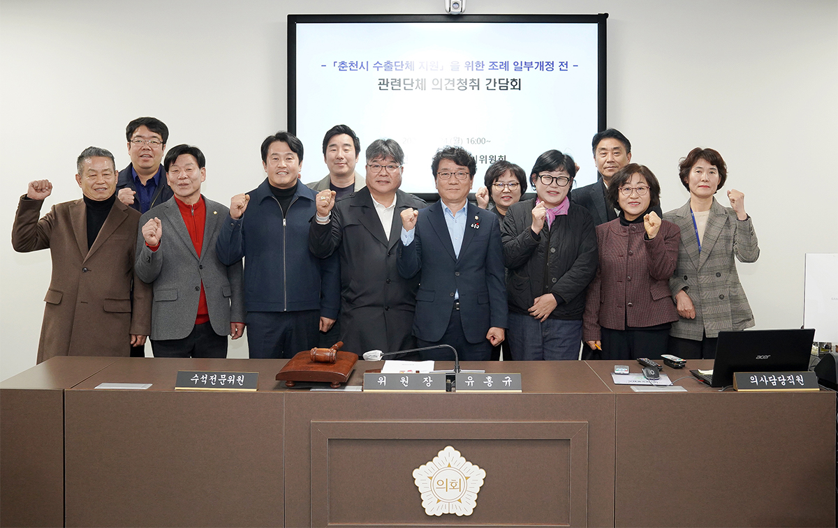 경제도시위원회(위원장 유홍규)는 11.24.(월) ‘춘천시 수출관련 단체 지원’을 위한 조례 개정 추진 간담회를 열었다. 간담회에는 경제도시위원들, 춘천수출협회 관계자 및 관련 부서 담당자들이 참석해「춘천시 중소기업 활성화 지원 조례」개정 방향에 대해 논의했다.
