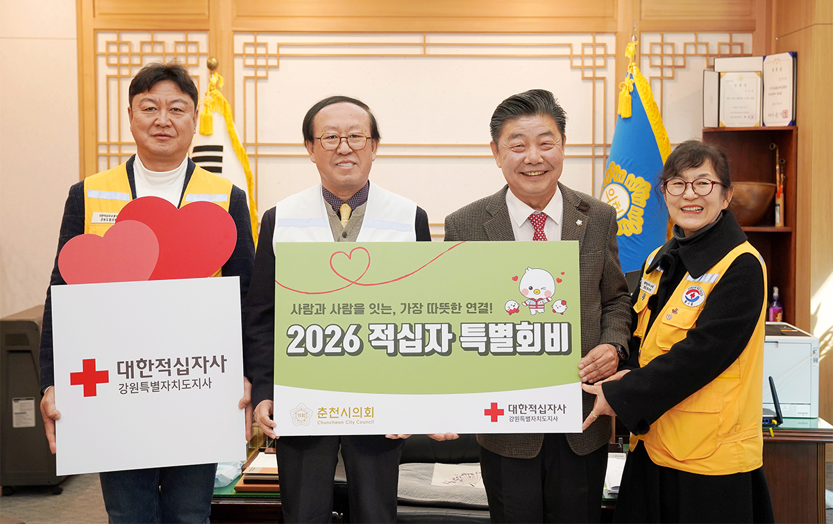 춘천시의회(의장 김진호)는 12.3.(수) 시의회 의장실에서 대한적십자사 강원특별자치도지사에 2026년도 적십자 특별회비를 전달했다.