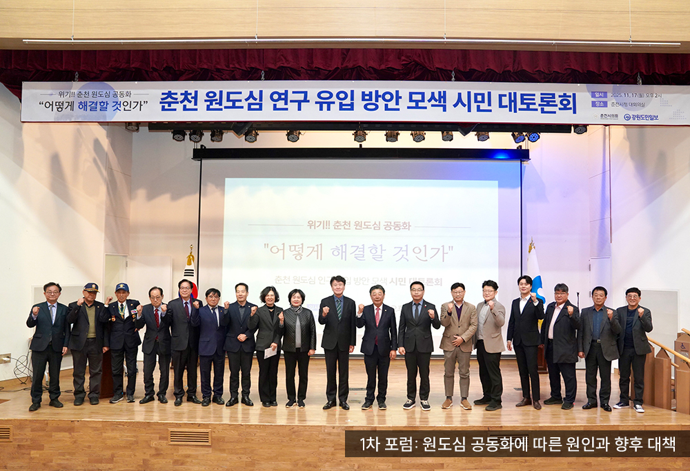 11.17.(월) 열린 1차 포럼 ‘원도심 공동화에 따른 원인과 향후 대책’에서는 구도심 인구 감소와 지역 활성화 방안을 중심으로 심도 있는 토론이 이어졌다. 김영배 연구회장은 춘천 원도심의 재건축·재개발을 통해 신규 공동주택을 공급하고 인구 유입을 도모함으로써 도시 활력과 균형 발전을 회복해야 한다고 강조했다.