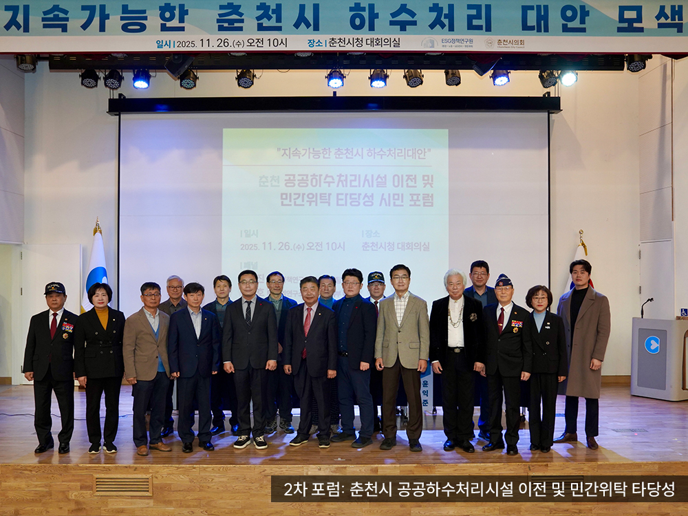 이어 11.26.(수) 열린 2차 포럼 ‘춘천시 공공하수처리시설 이전 및 민간위탁 타당성’에서는 시민과 전문가가 함께 주민들의 일상과 도시 환경을 고려한 정책 방향을 논의했다.